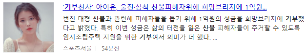 기부하기로 유명한 가수 아이유 또한 1억원을 기부하였다.