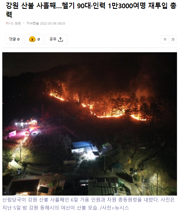 이날 산림당국에 따르면 날이 밝자 울진·삼척 산불현장을 비롯해 강릉 옥계, 동해, 영월 산불 현장에 헬기 90대와 진화인력을 1만3000명을 투입해 진화작전을 재개했다. 산불 진압 현장에는 약 90대의 헬기가 투입된다고 한다.