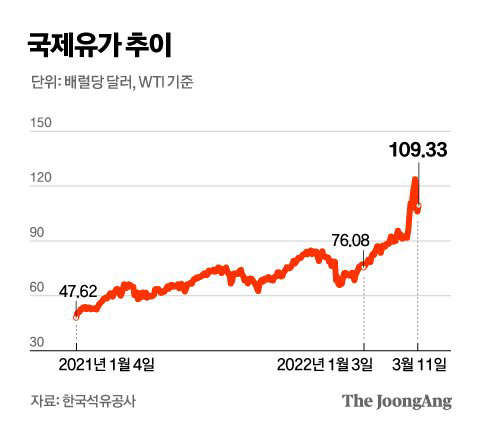 간단하게 말하자면 우크라이나와 러시아의 사태로 인해 국제유가 폭등이 원인이다.