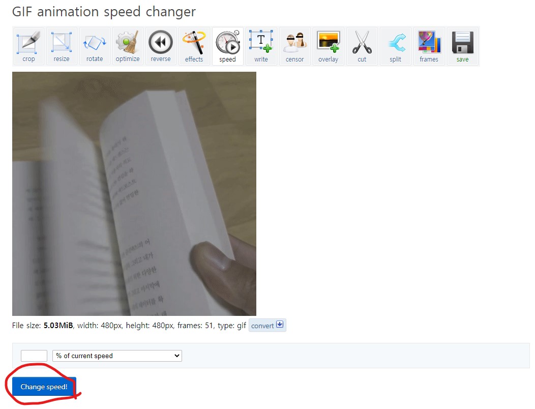 CHANGE SPEED 버튼 클릭하시면 기존 움짤이랑 비교하실 수 있도록 위 아래에 표시가 됩니다.