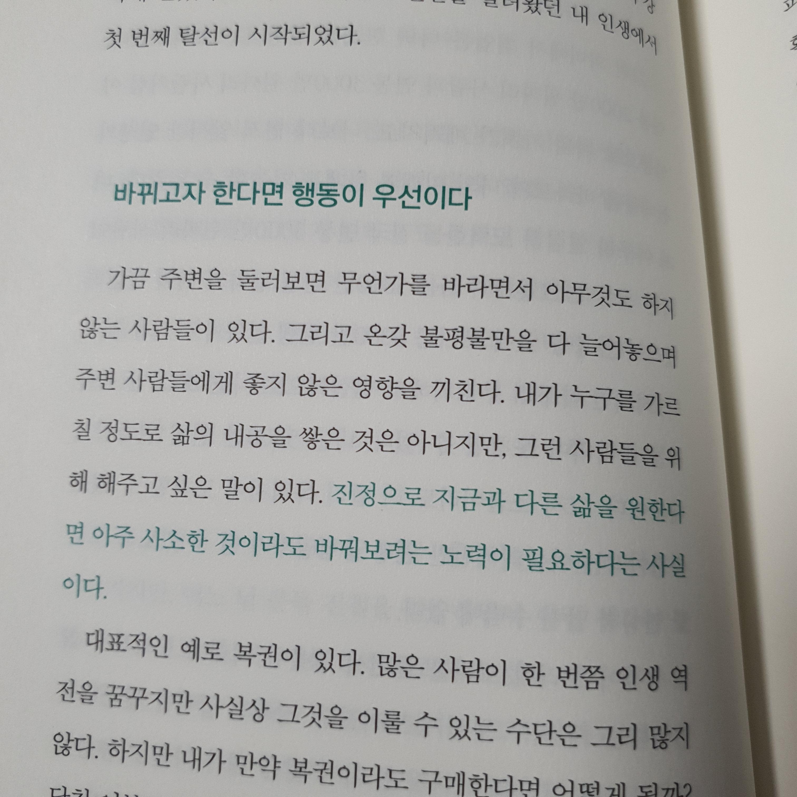 진정으로 지금과 다른 삶을 원한다면 아주 사소한 것이라도 바꿔보려는 노력이 필요하다는 사실이다.