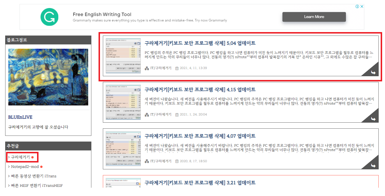 사진처럼 왼쪽 추천글 상단에 있는 구라제거기를 클릭하시고 제일 위에 있는 글을 클릭하시면 다운로드하는 방법이 나오고 있습니다. 참고해주세요.