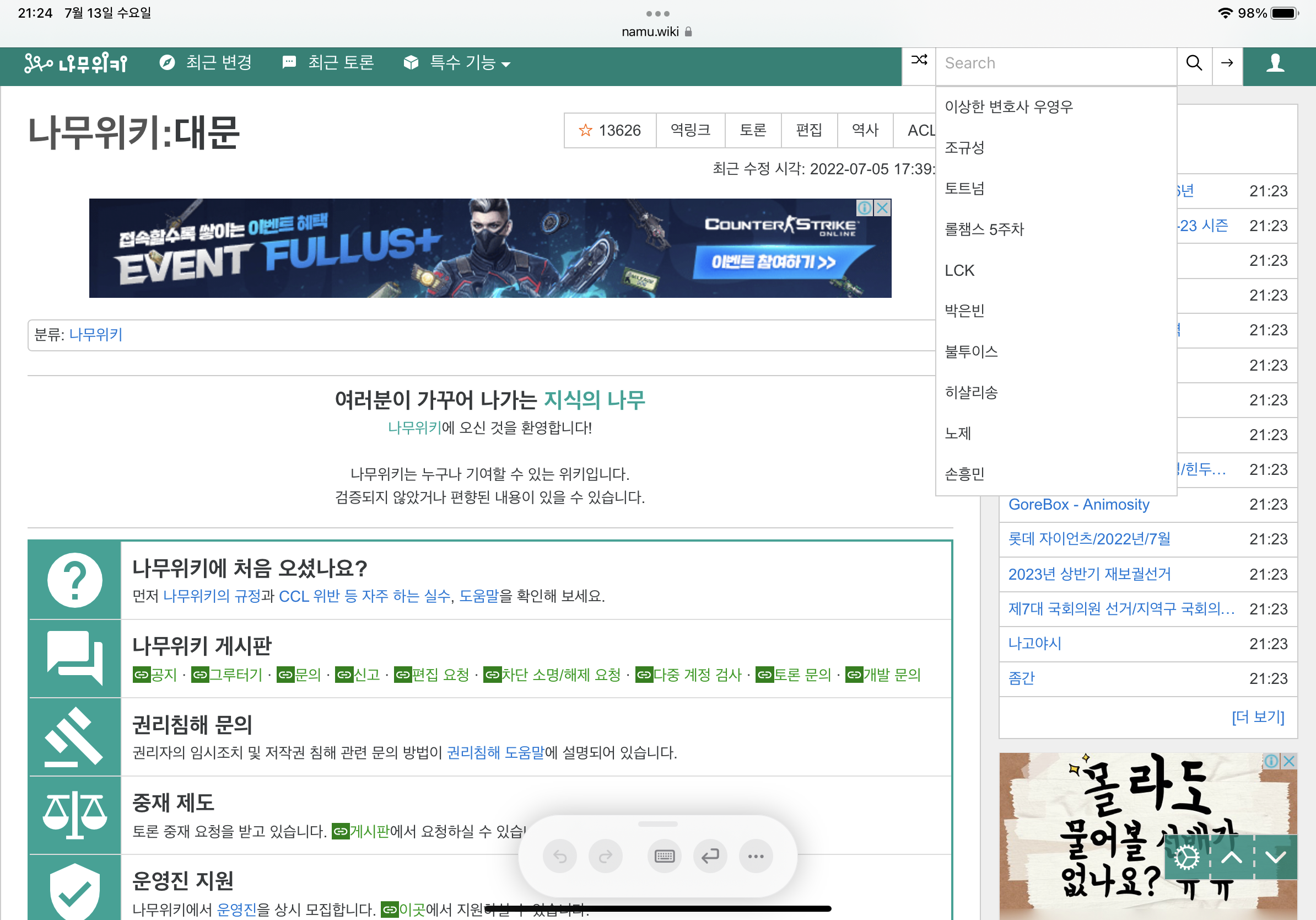 나무위키에 검색창을 클릭했을 때 나오는 검색어들을 확인한다. 네이버 실시간 검색어가 사라진 이후 사람들이 가장 많이 이용하고 있는 방법이라 생각된다. 실제로 급상승 검색어 관련하여 나오는 것 같다. 예를 들어 드라마 시간에 해당 드라마가 검색어에 노출되기도 한다.