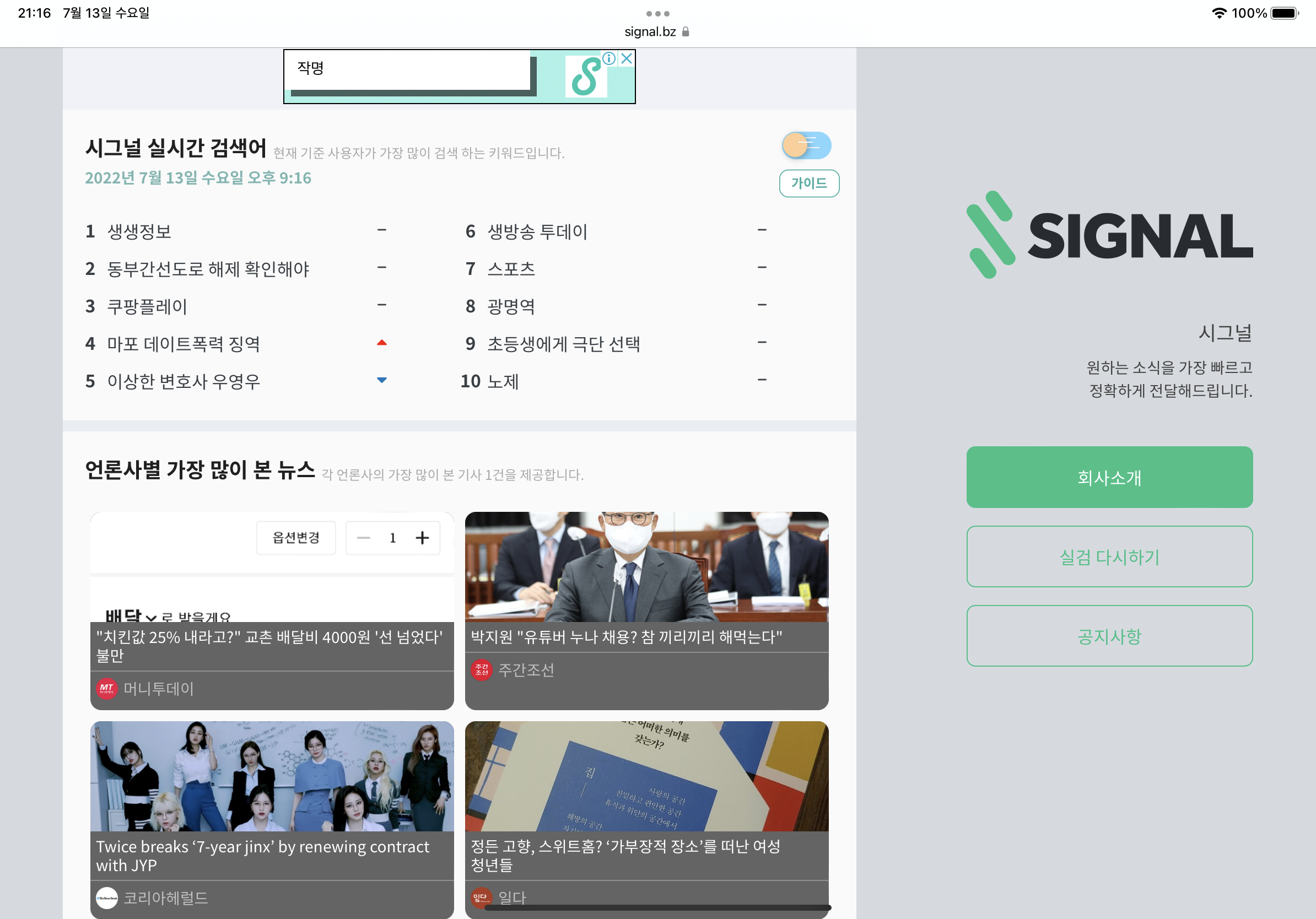'시그널 실시간 검색어'라는 포털사이트이다. 실시간 검색어 활용에 가장 많이 쓰이고 대중적으로도 알려져 있는 것 같고 가장 정확한 방법 같아서 추천한다. 네이버 메인에 연동이 가능하기에 가장 추천하는 방식이다.