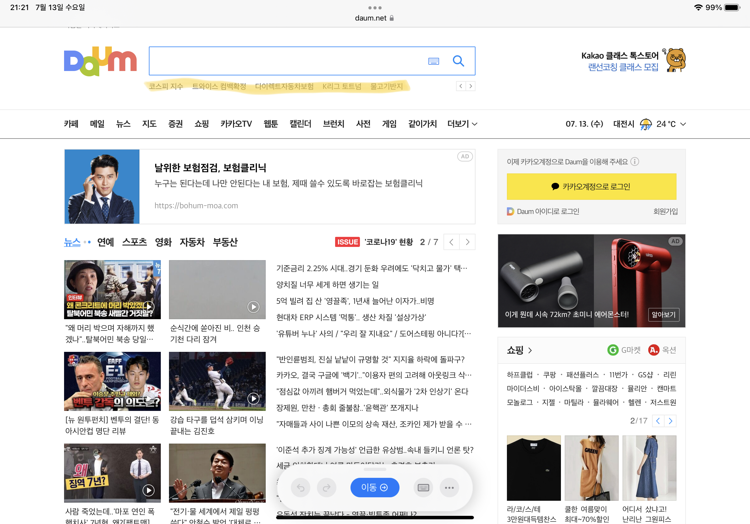 다음 검색란 밑에 형광팬으로 칠해진 부분을 실시간 검색어 대신 활용할 때도 있다.