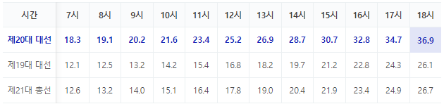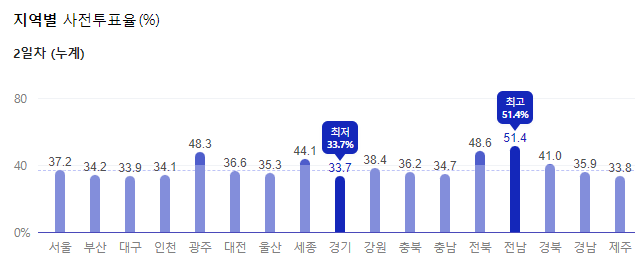 3월 4일, 3월 5일 동안 진행된 제20대 대선 사전투표율은 지역별로 전남지역이 51.4%로 최고치에 달했고, 경기지역이 33.7%로 최저치로 마감되었다. 하지만 이는 제19대 대선보다 높은 수치를 기록해주었고 심지어 제21대 총선보다도 높은 수치를 기록해주었다.