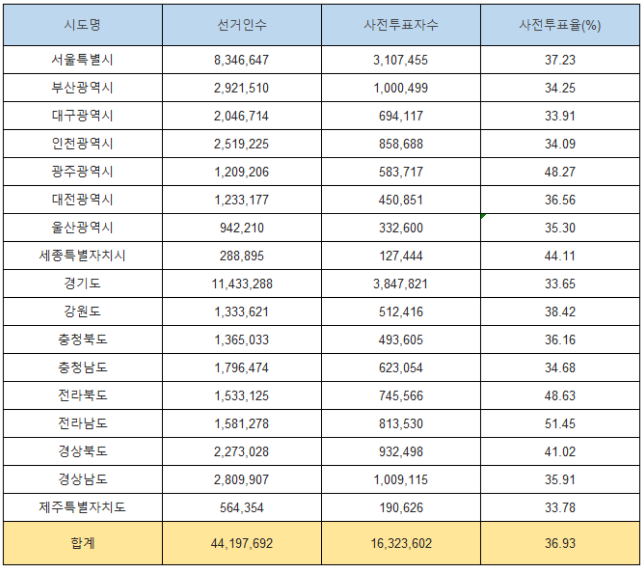 지역별 인원수와 사전투표현황을 정확하게 정리하자면 아래와 같다.