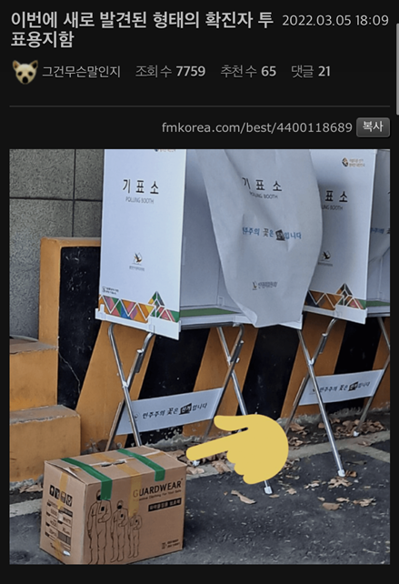 이러한 가운데 코로나로 인해 자가격리 중이거나 코로나 확진자들의 사전투표는 어떻게 진행이 되느냐라는 궁금증도 생겼다. 현재 SNS에 돌아다니는 글에 의하면 투표를 할 수 있는 환경은 만들어줬지만 상당히 빈약하다고 하며 공정한 사전투표가 되었을지 의심스럽기도 하다.