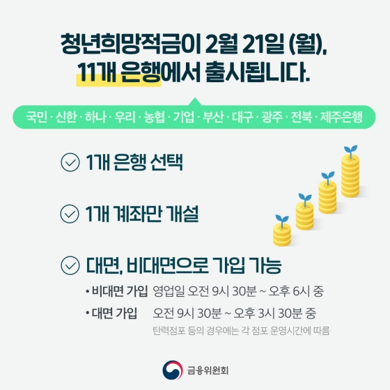 2022년 02월 21일에 청년희망저축이 출시되었고 은행마다 이자율이 다르다고 한다.