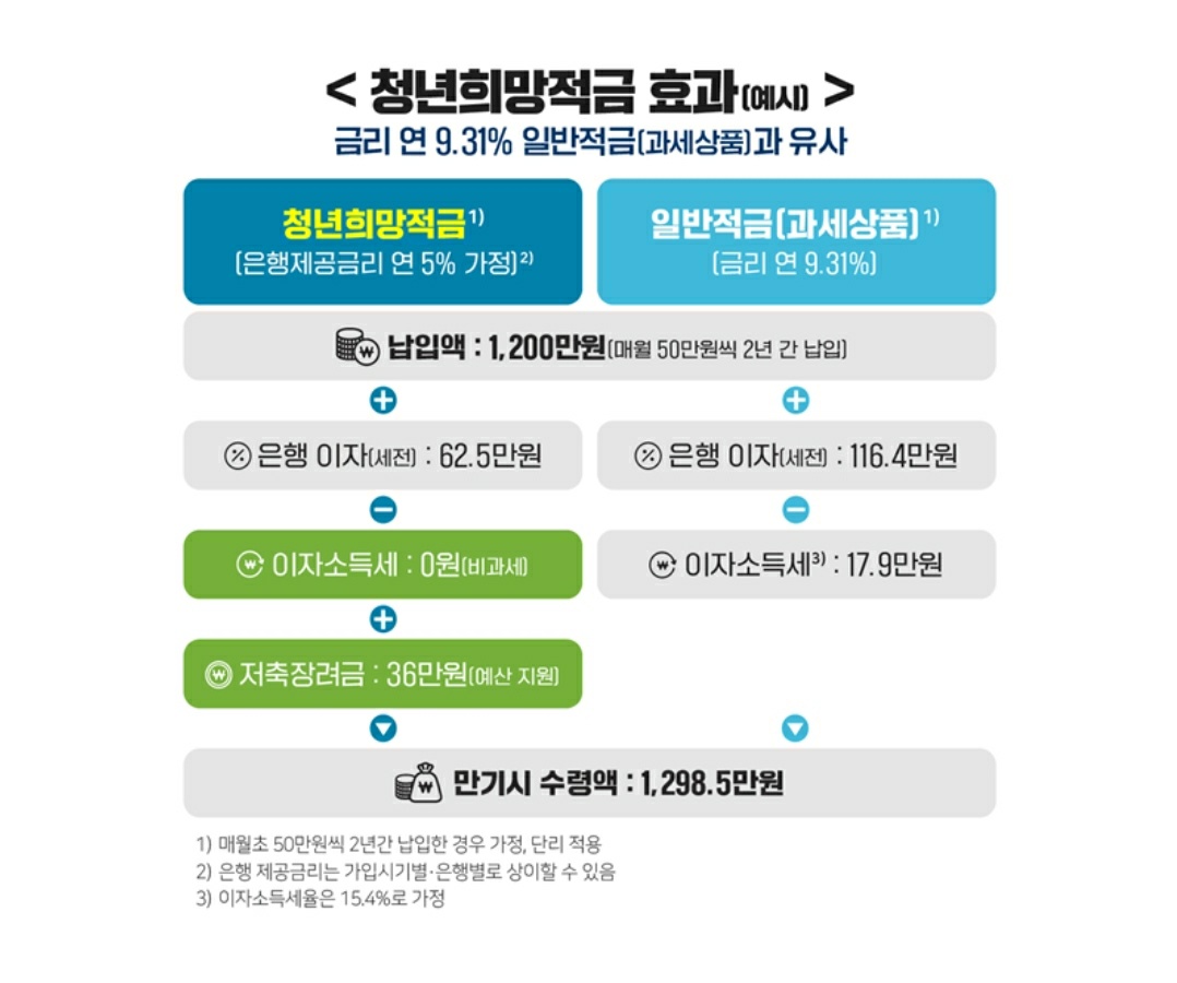 - 지원 내용 : 각 은행이자 + 이자소득 비과세 + 저축장려금 지원